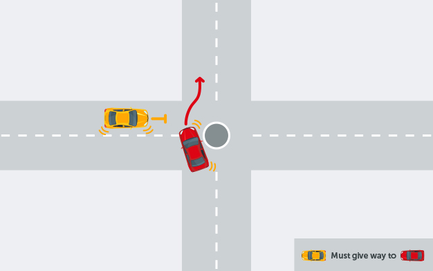 Drivers must give way to all vehicles already travelling on the roundabout, not just those to the right of them. If two drivers arrive at the same time, the car to the right goes first.
